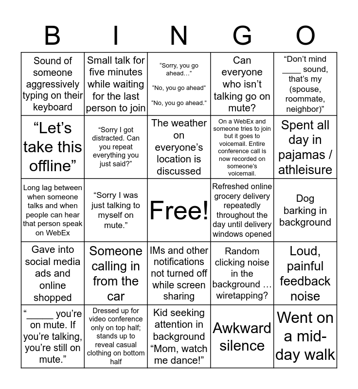 This bingo card has a free space and 29 words: “_____ you’re on mute. If you’re talking, you’re still on mute.”, “Can everyone hear me?”, “Sorry I was just talking to myself on mute.”, VPN and other connectivity issues, Sound of someone aggressively typing on their keyboard, “Sorry, you go ahead…” “No, you go ahead” “No, you go ahead.”, “Sorry I got distracted. Can you repeat everything you just said?”, Someone calling in from the car, Refreshed online grocery delivery repeatedly throughout the day until delivery windows opened, Dressed up for video conference only on top half; stands up to reveal casual clothing on bottom half, Dog barking in background, Went on a mid-day walk, Kid seeking attention in background “Mom, watch me dance!”, Awkward silence, Spent all day in pajamas / athleisure, Robotic voice due to connection issues, IMs and other notifications not turned off while screen sharing, Gave into social media ads and online shopped, “Don’t mind ____ sound, that’s my (spouse, roommate, neighbor)”, Long lag between when someone talks and when people can hear that person speak on WebEx, Random clicking noise in the background … wiretapping?, Ended a call / email with “Stay healthy”, On a WebEx and someone tries to join but it goes to voicemail. Entire conference call is now recorded on someone’s voicemail., “Let’s take this offline”, Can everyone who isn’t talking go on mute?, Small talk for five minutes while waiting for the last person to join, Loud, painful feedback noise, The weather on everyone’s location is discussed and A request for feedback or questions is met with complete silence.