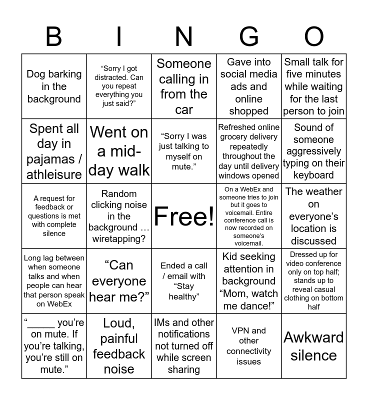 This bingo card has a free space and 24 words: “_____ you’re on mute. If you’re talking, you’re still on mute.”, “Can everyone hear me?”, “Sorry I was just talking to myself on mute.”, VPN and other connectivity issues, Sound of someone aggressively typing on their keyboard, Dog barking in the background, “Sorry I got distracted. Can you repeat everything you just said?”, Someone calling in from the car, Refreshed online grocery delivery repeatedly throughout the day until delivery windows opened, Dressed up for video conference only on top half; stands up to reveal casual clothing on bottom half, A request for feedback or questions is met with complete silence, Went on a mid-day walk, Kid seeking attention in background “Mom, watch me dance!”, Awkward silence, Spent all day in pajamas / athleisure, Loud, painful feedback noise, IMs and other notifications not turned off while screen sharing, Gave into social media ads and online shopped, The weather on everyone’s location is discussed, Long lag between when someone talks and when people can hear that person speak on WebEx, Random clicking noise in the background … wiretapping?, Ended a call / email with “Stay healthy”, On a WebEx and someone tries to join but it goes to voicemail. Entire conference call is now recorded on someone’s voicemail. and Small talk for five minutes while waiting for the last person to join.