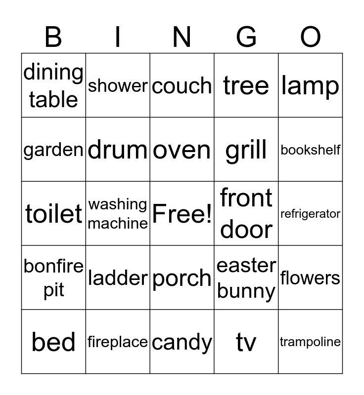 This bingo card has a free space and 24 words: ladder, fireplace, oven, bed, lamp, dining table, garden, shower, front door, porch, grill, toilet, easter bunny, flowers, drum, tv, refrigerator, couch, bookshelf, washing machine, trampoline, bonfire pit, tree and candy.