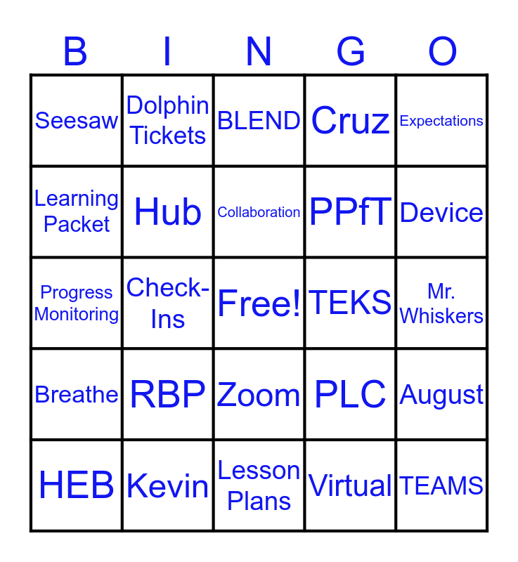 This bingo card has a free space and 24 words: RBP, Kevin, Collaboration, HEB, Expectations, Seesaw, Learning Packet, Dolphin Tickets, TEKS, Zoom, PPfT, Progress Monitoring, PLC, August, Hub, Virtual, Mr. Whiskers, BLEND, Device, Check-Ins, TEAMS, Breathe, Cruz and Lesson Plans.