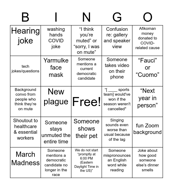 This bingo card has a free space and 24 words: Someone stays unmuted the entire time, Someone mentions a democratic candidate no longer in the race, Someone mentions a current democratic candidate, March Madness, Afikoman money donated to COVID-related cause, Hearing joke, tech jokes/questions, washing hands COVID joke, “[ ____ sports team] would've won if the season weren't cancelled", Someone shows their pet, Someone takes video on their phone, Background convo from people who think they’re on mute, Singing sounds even worse than usual because of the lag, fun Zoom background, Yarmulke face mask, Someone mispronounces an English word while reading, “Next year in person”, “I think you’re muted” or “sorry, I was on mute”, “Fauci” or “Cuomo”, New plague, Joke about how good someone else’s dinner smells, Shoutout to healthcare & essential workers, Confusion re: gallery and speaker view and We do not start “promptly at 6:00 PM (Eastern Daylight Time in the US)”.