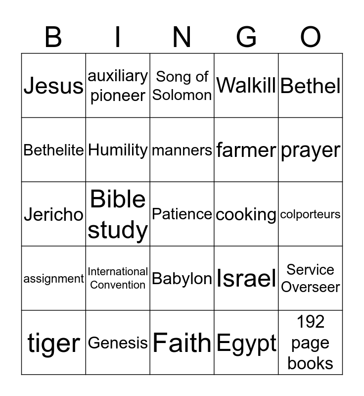 This bingo card has 108 words: JW.org, return visits, Bible study, Family Worship, Broadcast, field service report, not at homes, territory, door to door, magazines, Watchtower, Awake!, publisher, elder, ministerial servant, pioneer, auxiliary pioneer, Pioneer School, Circuit Assembly, Regional Convention, International Convention, Circuit Overseer, Circuit Overseer's Wife, Missionary, Gilead, Bethel, Bethelite, Walkill, Patterson, IBSA, 192 page books, Genesis, Revelation, Psalms, Proverbs, Song of Solomon, Love, Joy, Peace, Patience, Kindness, Goodness, Faith, Mildness, Self Control, Humility, cleanliness, manners, hospitality, cooking, sound department, prayer, assignment, Moses, Delilah, Samson, Peter, Isaac, Eve, Jesus, David, Jeremiah, Mary, LDC, Law Covenant, Governing Body, Faithful and Discreet Slave, Service Overseer, Congregation Secretary, Israel, Babylon, Jericho, Egypt, heaven, Jerusalem, Canaan, Bethlehem, Jael, Hannah, Rebecca, Matthew, sheep, wolf, goat, ark, temple, crown, throne, rod, flowers, manna, farmer, shepherd, soldier, waterfall, resurrection, panda, tiger, elephant, Memorial, Festival of Booths, Teaching Committee, Writing Committee, 1935, 1935, 1914, colporteurs and Jehovah.