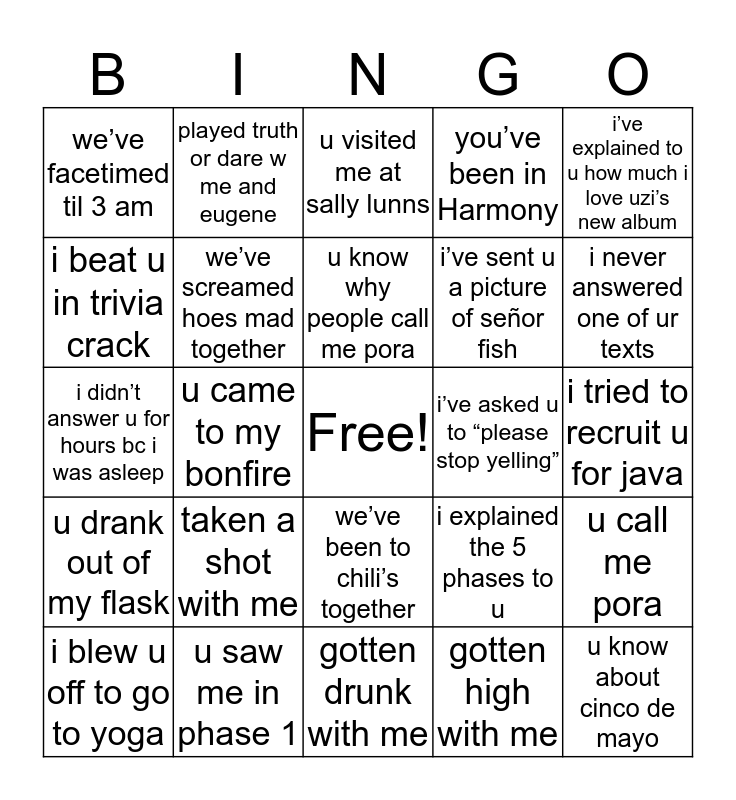 This bingo card has a free space and 24 words: taken a shot with me, u saw me in phase 1, u know why people call me pora, i blew u off to go to yoga, i’ve explained to u how much i love uzi’s new album, we’ve facetimed til 3 am, i beat u in trivia crack, played truth or dare w me and eugene, i’ve asked u to “please stop yelling”, we’ve been to chili’s together, i’ve sent u a picture of señor fish, i didn’t answer u for hours bc i was asleep, i explained the 5 phases to u, u call me pora, we’ve screamed hoes mad together, gotten high with me, i tried to recruit u for java, u visited me at sally lunns, i never answered one of ur texts, u came to my bonfire, u know about cinco de mayo, u drank out of my flask, you’ve been in Harmony and gotten drunk with me.