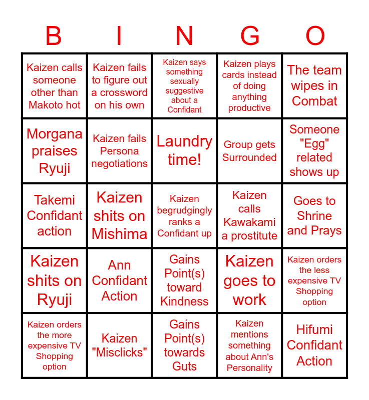 This bingo card has 60 words: Futaba Confidant Action, Kaizen "Misclicks", Kaizen shits on Yusuke, Kaizen shits on Ryuji, Kaizen mentions something about Ann's Personality, 4x Baton Pass, Kaizen fails Persona negotiations, Kaizen argues that Makoto is top waifu, Group gets Surrounded, Kaizen changes something in the Thieves Den, Kaizen plays cards instead of doing anything productive, Gains point(s) toward Knowledge, Morgana praises Ryuji, Morgana shits on Ryuji, Kaizen goes into Mementos, Kaizen calls someone other than Makoto hot, Kaizen begrudgingly ranks a Confidant up, The team wipes in Combat, Our team name is mentioned, Laundry time!, Kaizen calls Kawakami a prostitute, Kaizen says something sexually suggestive about a Confidant, Kaizen orders the more expensive TV Shopping option, Kaizen orders the less expensive TV Shopping option, Kaizen figures out a crossword on his own, Kaizen says "Joseeee" instead of "Josayyyyy", Ohya Confidant Action, Special "Rare" Persona Caught or Defeated, Someone "Egg" related shows up, Gains Point(s) towards Charm, Read a book on the Subway, Someone in-game notices Morgana in cat form, Get Drained, Get Blocked, Kaizen fails to figure out a crossword on his own, Kaizen subconsiously starts singing along with ingame music, All-Out Attack x3 in one battle, Kaizen shits on Mishima, Kaizen fucks up a clearly Japanese name, Takemi Confidant action, Ryuji Confidant Action, Ann Confidant Action, Goes to Shrine and Prays, Maruki Confidant Action, Kaizen goes to work, Sojiro Confidant Action, Iwai Confidant Action, Yusuke Confidant Action, Gains Point(s) toward Proficiency, Gains Point(s) toward Kindness, Gains Point(s) towards Guts, Get Reflected, Kaizen shits on Goro, Makoto Confidant Action, Kaizen Swoons for Makoto, Plays Darts, Plays Billiards, Chihaya Confidant Action, Hifumi Confidant Action and Training (HP OR SP).