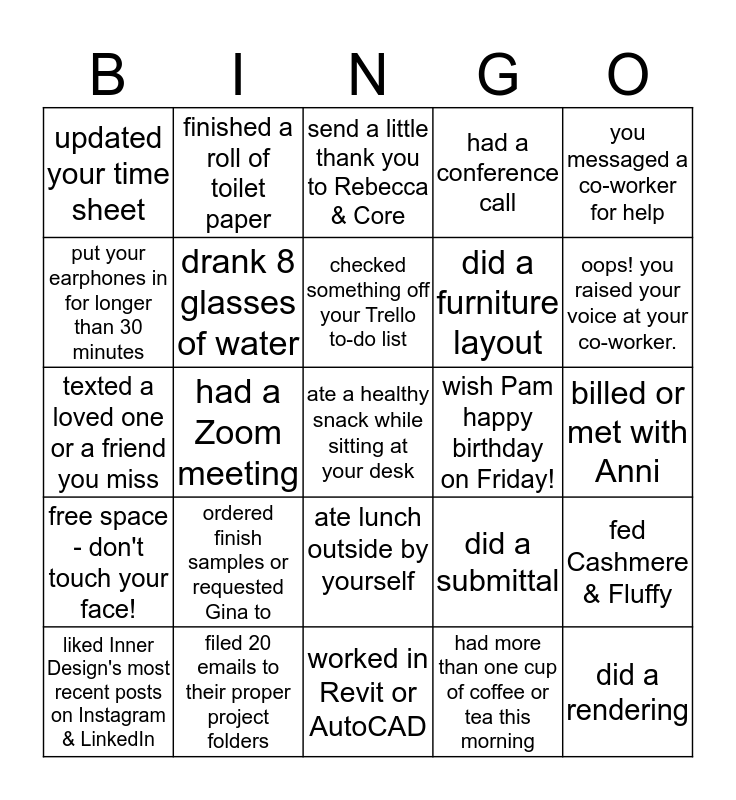 This bingo card has a free space and 34 words: your co-worker hasn't made you mad today!, had more than one cup of coffee or tea this morning, checked the COVID-19 counts for the day, sent out a deadline!, free space - don't touch your face!, drank 8 glasses of water, you messaged a co-worker for help, liked Inner Design's most recent posts on Instagram & LinkedIn, finished a roll of toilet paper, updated Trello before 3:30pm, checked something off your Trello to-do list, send a little thank you to Rebecca & Core, went on a walk (not to the fridge!), received a COVID-19 email update from a company, wish Pam happy birthday on Friday!, oops! you raised your voice at your co-worker., filed 20 emails to their proper project folders, texted a loved one or a friend you miss, ordered finish samples or requested Gina to, did a submittal, ate lunch outside by yourself, logged in to the server before 8:00AM, updated your time sheet, billed or met with Anni, worked in Revit or AutoCAD, did a rendering, had a conference call, redlined drawings, did a furniture layout, put your earphones in for longer than 30 minutes, put on jeans or actual pants before the 8:30AM call, had a Zoom meeting, fed Cashmere & Fluffy and attended a CEU.