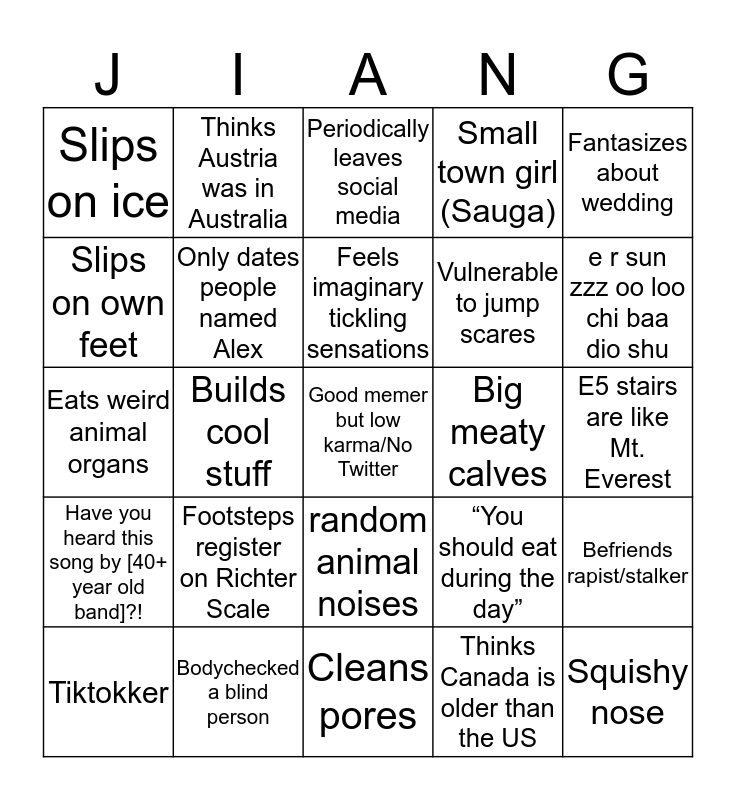 This bingo card has 25 words: Footsteps register on Richter Scale, Cleans pores, Feels imaginary tickling sensations, Tiktokker, Fantasizes about wedding, Slips on ice, Slips on own feet, Thinks Austria was in Australia, Big meaty calves, random animal noises, Vulnerable to jump scares, Eats weird animal organs, “You should eat during the day”, Befriends rapist/stalker, Only dates people named Alex, Squishy nose, E5 stairs are like Mt. Everest, Periodically leaves social media, e r sun zzz oo loo chi baa dio shu, Builds cool stuff, Good memer but low karma/No Twitter, Bodychecked a blind person, Have you heard this song by [40+ year old band]?!, Small town girl (Sauga) and Thinks Canada is older than the US.