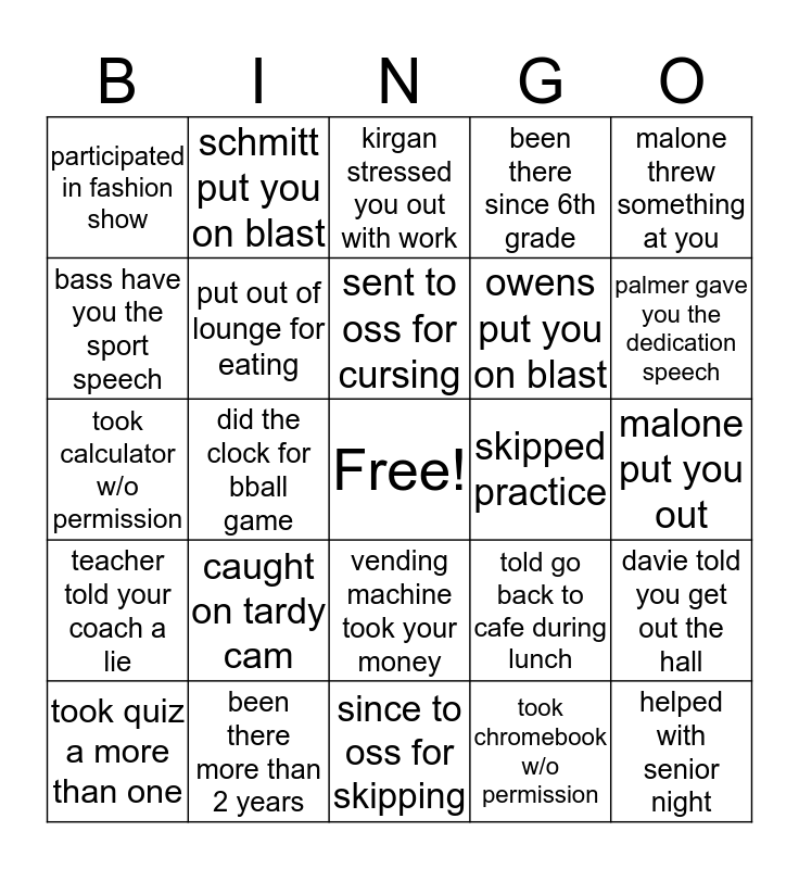This bingo card has a free space and 24 words: caught on tardy cam, been there more than 2 years, sent to oss for cursing, took quiz a more than one, malone threw something at you, participated in fashion show, bass have you the sport speech, schmitt put you on blast, skipped practice, vending machine took your money, owens put you on blast, took calculator w/o permission, told go back to cafe during lunch, davie told you get out the hall, put out of lounge for eating, took chromebook w/o permission, malone put you out, kirgan stressed you out with work, palmer gave you the dedication speech, did the clock for bball game, helped with senior night, teacher told your coach a lie, been there since 6th grade and since to oss for skipping.
