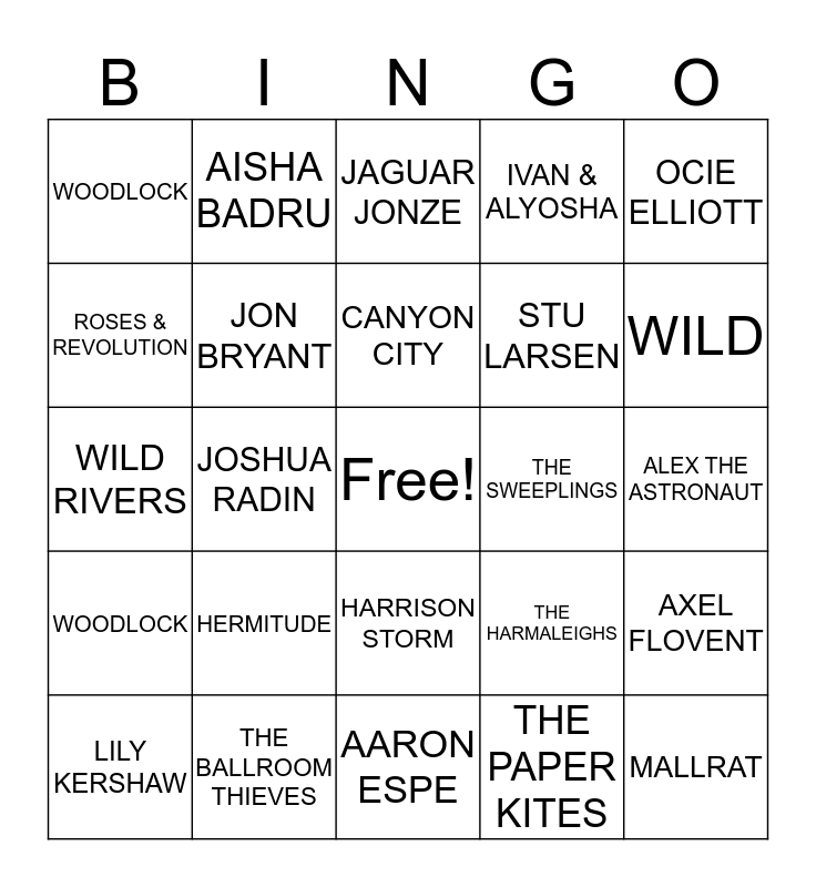 This bingo card has a free space and 29 words: LILY KERSHAW, PASSENGER, JOSHUA RADIN, KATHERINE PENFOLD, WOODLOCK, JAGUAR JONZE, JON BRYANT, HERMITUDE, THE SWEEPLINGS, THE BALLROOM THIEVES, ALEX THE ASTRONAUT, MALLRAT, AARON ESPE, THE PAPER KITES, WILD, JOSH HYSLOP, HARRISON STORM, WOODLOCK, OCIE ELLIOTT, WILD RIVERS, THE HARMALEIGHS, HOLLOW COVES, STU LARSEN, ROSES & REVOLUTION, IVAN & ALYOSHA, AISHA BADRU, AXEL FLOVENT, CANYON CITY and SAMMY RAE.