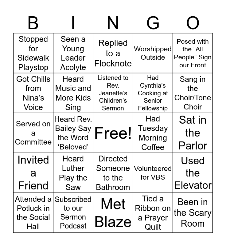 This bingo card has a free space and 24 words: Heard Luther Play the Saw, Subscribed to our Sermon Podcast, Listened to Rev. Jeanette’s Children’s Sermon, Attended a Potluck in the Social Hall, Posed with the “All People” Sign our Front, Stopped for Sidewalk Playstop, Got Chills from Nina’s Voice, Seen a Young Leader Acolyte, Had Tuesday Morning Coffee, Directed Someone to the Bathroom, Had Cynthia’s Cooking at Senior Fellowship, Served on a Committee, Volunteered for VBS, Used the Elevator, Heard Music and More Kids Sing, Tied a Ribbon on a Prayer Quilt, Sat in the Parlor, Replied to a Flocknote, Sang in the Choir/Tone Choir, Heard Rev. Bailey Say the Word ‘Beloved’, Been in the Scary Room, Invited a Friend, Worshipped Outside and Met Blaze.
