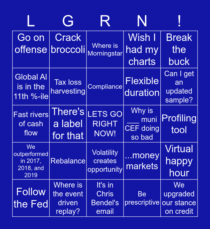 This bingo card has a free space and 24 words: Follow the Fed, Rebalance, Compliance, Be prescriptive, Break the buck, Go on offense, Crack broccoli, Where is Morningstar, Why is ___ muni CEF doing so bad, Profiling tool, Fast rivers of cash flow, Tax loss harvesting, ...money markets, Virtual happy hour, Global Al is in the 11th %-ile, Where is the event driven replay?, It's in Chris Bendel's email, Wish I had my charts, Can I get an updated sample?, We outperformed in 2017, 2018, and 2019, There's a label for that, Volatility creates opportunity, Flexible duration and We upgraded our stance on credit.