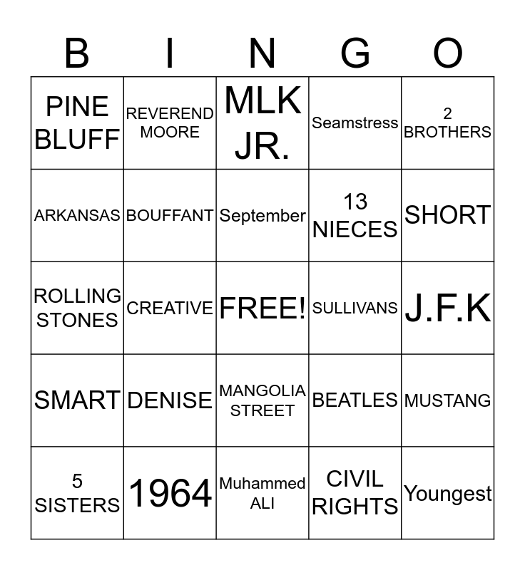 This bingo card has a free space and 24 words: DENISE, 1964, September, 5 SISTERS, 2 BROTHERS, PINE BLUFF, ARKANSAS, REVEREND MOORE, SULLIVANS, MANGOLIA STREET, 13 NIECES, ROLLING STONES, BEATLES, MUSTANG, BOUFFANT, CIVIL RIGHTS, J.F.K, MLK JR., SHORT, CREATIVE, Youngest, SMART, Seamstress and Muhammed ALI.
