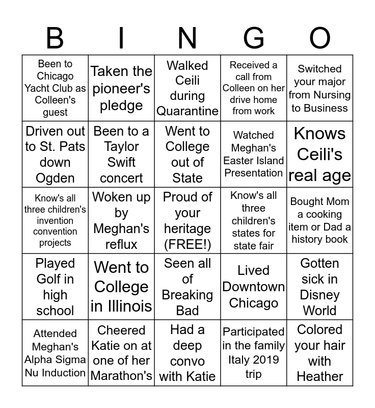 This bingo card has a free space and 24 words: Went to College in Illinois, Cheered Katie on at one of her Marathon's, Went to College out of State, Attended Meghan's Alpha Sigma Nu Induction, Switched your major from Nursing to Business, Been to Chicago Yacht Club as Colleen's guest, Driven out to St. Pats down Ogden, Taken the pioneer's pledge, Know's all three children's states for state fair, Seen all of Breaking Bad, Watched Meghan's Easter Island Presentation, Know's all three children's invention convention projects, Lived Downtown Chicago, Gotten sick in Disney World, Been to a Taylor Swift concert, Participated in the family Italy 2019 trip, Bought Mom a cooking item or Dad a history book, Walked Ceili during Quarantine, Knows Ceili's real age, Woken up by Meghan's reflux, Colored your hair with Heather, Played Golf in high school, Received a call from Colleen on her drive home from work and Had a deep convo with Katie.