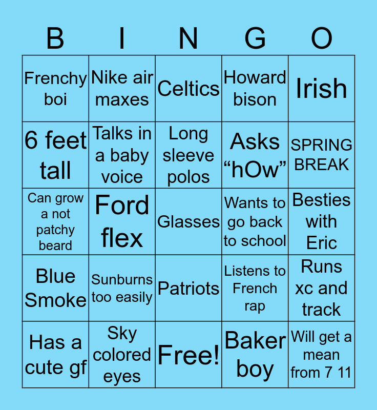 This bingo card has 25 words: Blue Smoke, Sky colored eyes, Glasses, Baker boy, Irish, Frenchy boi, Nike air maxes, Celtics, Wants to go back to school, Runs xc and track, 6 feet tall, Talks in a baby voice, Free!, Listens to French rap, SPRING BREAK, Has a cute gf, Ford flex, Long sleeve polos, Asks “hOw”, Besties with Eric, Can grow a not patchy beard, Sunburns too easily, Patriots, Howard bison and Will get a mean from 7 11.