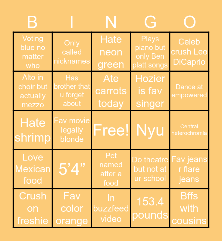 This bingo card has a free space and 24 words: 5’4”, Fav color orange, Ate carrots today, Crush on freshie, Celeb crush Leo DiCaprio, Voting blue no matter who, Alto in choir but actually mezzo, Only called nicknames, Nyu, Pet named after a food, Hozier is fav singer, Hate shrimp, Do theatre but not at ur school, Fav jeans r flare jeans, Has brother that u forget about, 153.4 pounds, Central heterochromia, Hate neon green, Dance at empowered, Fav movie legally blonde, Bffs with cousins, Love Mexican food, Plays piano but only Ben platt songs and In buzzfeed video.
