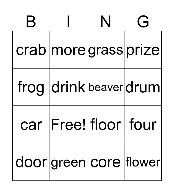 This bingo card has 16 words: green, four, grass, crab, car, more, floor, core, frog, drink, door, prize, Free!, drum, beaver and flower.