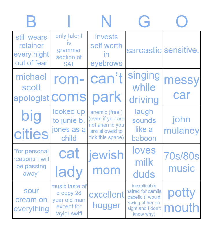 This bingo card has a free space and 24 words: cat lady, music taste of creepy 28 year old man except for taylor swift, can’t park, sour cream on everything, sensitive., still wears retainer every night out of fear, michael scott apologist, only talent is grammar section of SAT, laugh sounds like a baboon, jewish mom, singing while driving, big cities, loves milk duds, 70s/80s music, rom-coms, inexplicable hatred for camila cabello (I would swing at her on sight and I don’t know why), john mulaney, invests self worth in eyebrows, messy car, looked up to junie b. jones as a child, potty mouth, “for personal reasons I will be passing away”, sarcastic and excellent hugger.