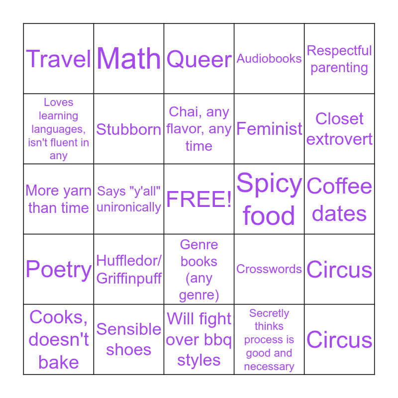 This bingo card has a free space and 24 words: Huffledor/ Griffinpuff, Sensible shoes, Chai, any flavor, any time, Cooks, doesn't bake, Respectful parenting, Travel, Loves learning languages, isn't fluent in any, Math, Spicy food, Genre books (any genre), Feminist, More yarn than time, Crosswords, Circus, Stubborn, Secretly thinks process is good and necessary, Coffee dates, Queer, Closet extrovert, Says "y'all" unironically, Circus, Poetry, Audiobooks and Will fight over bbq styles.