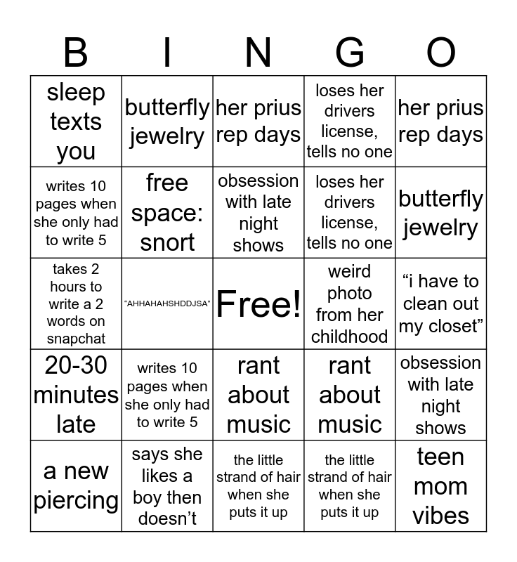 ⚠ This card has duplicate items: takes 2 hours to write a 2 words on snapchat (3), perfect hair curls (3), sleep texts you (3), doesn’t let you take a picture of her (3), shows you picture of wilma (3), says she likes a boy then doesn’t (3), 20-30 minutes late (3), does something weird w her hands (3), rant about music (3), “AHHAHAHSHDDJSA” (3), wearing something black and oversized (3), using something ridiculous in place of wallet (3), “i have to clean out my closet” (3), teen mom vibes (3), butterfly jewelry (3), the little strand of hair when she puts it up (3), writes 10 pages when she only had to write 5 (3), tagged in her moms fb post without knowledge (3), weird photo from her childhood (3), obsession with late night shows (3), loses her drivers license, tells no one (3), her prius rep days (3), bullet journaling moment (3), a new piercing (3)