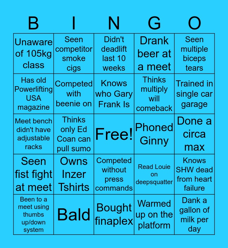 This bingo card has a free space and 24 words: Owns Inzer Tshirts, Bald, Knows who Gary Frank Is, Been to a meet using thumbs up/down system, Seen multiple biceps tears, Unaware of 105kg class, Has old Powerlifting USA magazine, Seen competitor smoke cigs, Phoned Ginny, Competed without press commands, Thinks multiply will comeback, Meet bench didn't have adjustable racks, Read Louie on deepsquatter, Knows SHW dead from heart failure, Competed with beenie on, Warmed up on the platform, Done a circa max, Didn't deadlift last 10 weeks, Trained in single car garage, Thinks only Ed Coan can pull sumo, Dank a gallon of milk per day, Seen fist fight at meet, Drank beer at a meet and Bought finaplex.