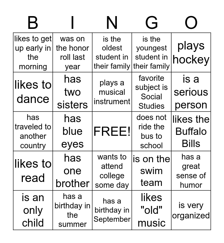 This bingo card has a free space and 24 words: has one brother, has a birthday in the summer, plays a musical instrument, is an only child, plays hockey, likes to get up early in the morning, likes to dance, was on the honor roll last year, does not ride the bus to school, wants to attend college some day, favorite subject is Social Studies, has traveled to another country, is on the swim team, has a great sense of humor, has two sisters, likes "old" music, likes the Buffalo Bills, is the oldest student in their family, is a serious person, has blue eyes, is very organized, likes to read, is the youngest student in their family and has a birthday in September.