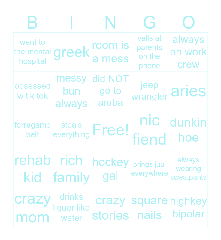 This bingo card has a free space and 24 words: rich family, drinks liquor like water, did NOT go to aruba, crazy mom, always on work crew, went to the mental hospital, obsessed w tik tok, greek, nic fiend, hockey gal, jeep wrangler, ferragamo belt, brings juul everywhere, always wearing sweatpants, messy bun always, square nails, dunkin hoe, room is a mess, aries, steals everything, highkey bipolar, rehab kid, yells at parents on the phone and crazy stories.