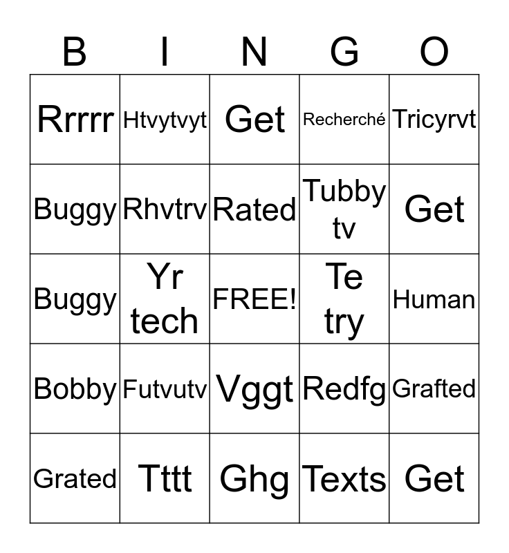 This bingo card has a free space and 24 words: Futvutv, Tttt, Rated, Grated, Tricyrvt, Rrrrr, Buggy, Htvytvyt, Te try, Vggt, Tubby tv, Buggy, Redfg, Grafted, Rhvtrv, Texts, Human, Get, Get, Yr tech, Get, Bobby, Recherché and Ghg.