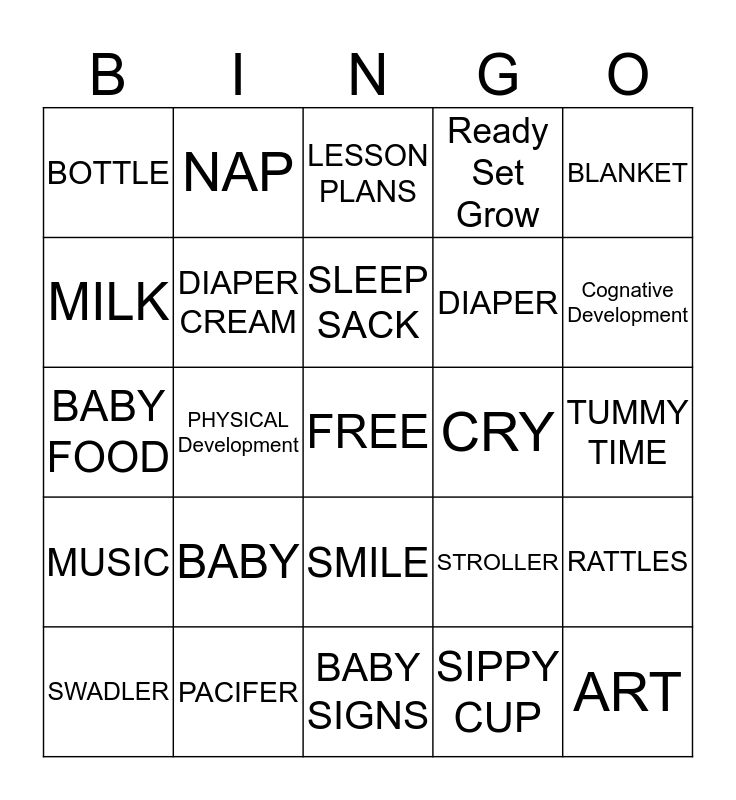 This bingo card has a free space and 24 words: BABY, PACIFER, SLEEP SACK, SWADLER, BLANKET, BOTTLE, MILK, NAP, CRY, SMILE, DIAPER, BABY FOOD, STROLLER, RATTLES, DIAPER CREAM, SIPPY CUP, TUMMY TIME, LESSON PLANS, Cognative Development, PHYSICAL Development, ART, MUSIC, Ready Set Grow and BABY SIGNS.