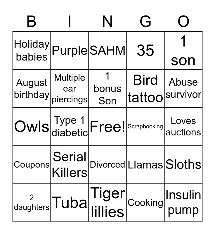 This bingo card has a free space and 24 words: Serial Killers, Tuba, 1 bonus Son, 2 daughters, 1 son, Holiday babies, August birthday, Purple, Scrapbooking, Divorced, Bird tattoo, Owls, Llamas, Sloths, Multiple ear piercings, Cooking, Loves auctions, SAHM, Abuse survivor, Type 1 diabetic, Insulin pump, Coupons, 35 and Tiger lillies.