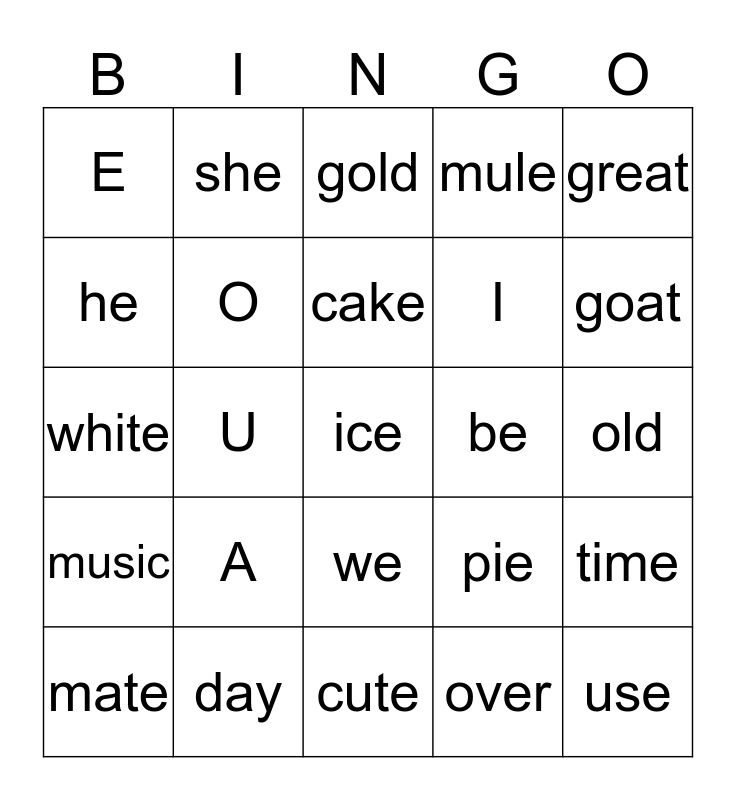 This bingo card has a free space and 24 words: A, day, cake, mate, great, E, he, she, be, we, I, white, pie, time, O, over, old, gold, goat, U, use, music, mule and cute.