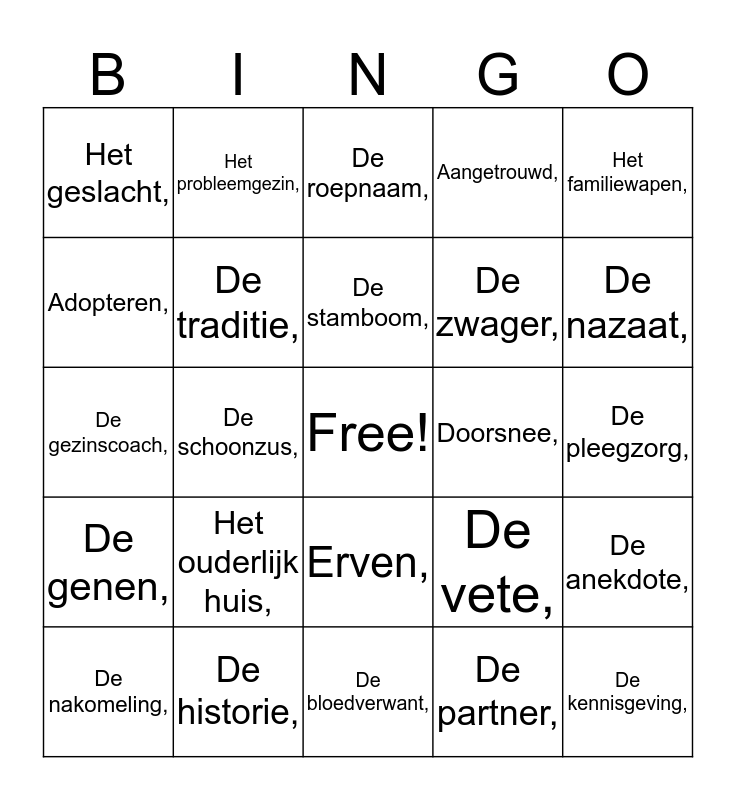 This bingo card has a free space and 38 words: De autobiografie,, Het gezinsleven,, Hecht,, De traditie,, De anekdote,, Het ouderlijk huis,, De stamboom,, De voorouder,, Het familiewapen,, De zwager,, De schoonzus,, Aangetrouwd,, De kennisgeving,, De pleegzorg,, Adopteren,, De genen,, De verwantschap,, De roepnaam,, De voogd,, Doorsnee,, Het geslacht,, De historie,, De nazaat,, De nakomeling,, Opvolgen,, De bloedverwant,, De stamvader,, De telg,, Senior,, Junior,, De gezinsuitbreiding,, Erven,, De partner,, Het probleemgezin,, Zorgzaam,, De vete,, De gezinscoach, and Harmonieus.