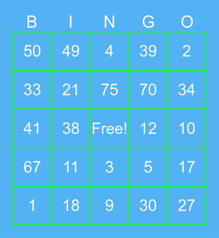 This bingo card has a free space and 24 words: 11, 18, 75, 1, 2, 50, 33, 49, 12, 3, 70, 41, 5, 17, 21, 30, 10, 4, 34, 38, 27, 67, 39 and 9.