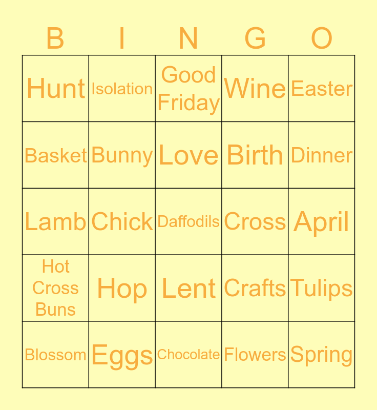 This bingo card has 30 words: Eggs, Bonnet, Chick, Bank Holiday, Hunt, Good Friday, Bunny, Lent, Cross, Chocolate, April, Daffodils, Flowers, Spring, Dinner, Mini Eggs, Crafts, Hot Cross Buns, Hop, Easter, Lamb, Church, Isolation, Birth, Basket, Wine, Tulips, Blossom, Love and Family.