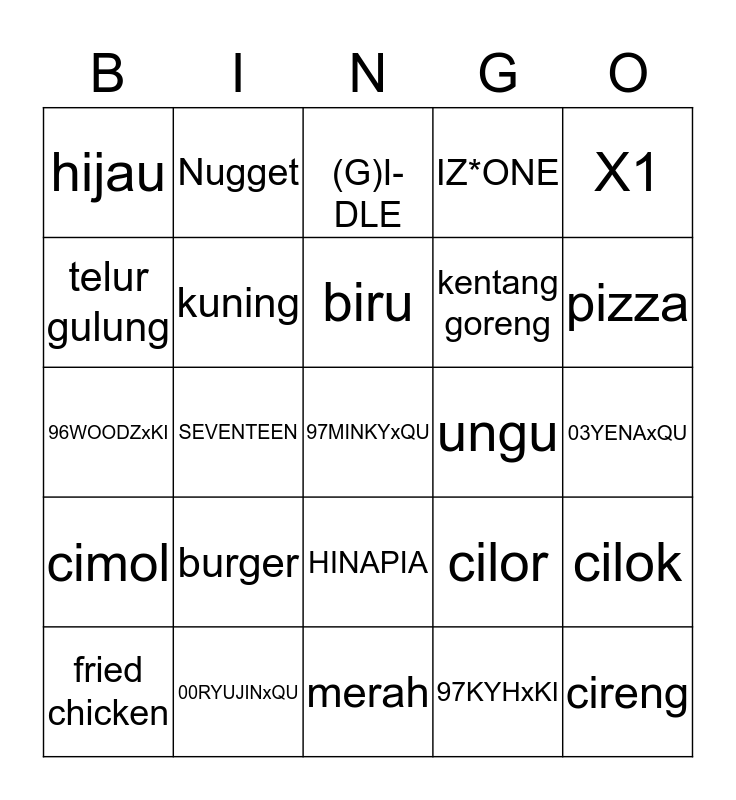 This bingo card has 25 words: burger, merah, biru, fried chicken, X1, hijau, telur gulung, Nugget, ungu, HINAPIA, kentang goreng, 96WOODZxKI, cilor, cilok, kuning, cireng, 03YENAxQU, (G)I-DLE, pizza, SEVENTEEN, 97MINKYxQU, 00RYUJINxQU, cimol, IZ*ONE and 97KYHxKI.