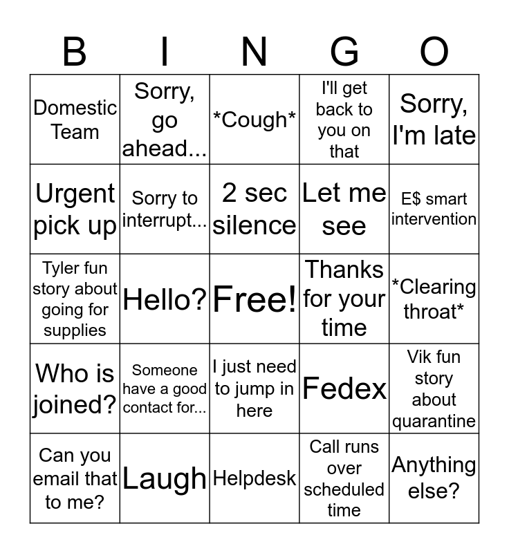 This bingo card has a free space and 39 words: Sorry?, *Typing sounds*, Your mute is on, Sorry to interrupt..., Can you email that to me?, I just need to jump in here, 2 sec silence, Ahm, Sorry, I'm late, Who is joined?, Hello?, I'll get back to you on that, Anything else?, *Clearing throat*, Thanks for your time, Someone have a good contact for..., Leanna, Domestic Team, Schenker, Fedex, Urgent pick up, Helpdesk, Let me see, E$ smart intervention, Welcome back Ashley, Thank you, Jack/Jag/Jaguar, X? Are you there?, Can everyone see my screen?, Sorry, go ahead..., Sorry, my dog is excited about this call, Sorry, I was having connection issues, *Cough*, Laugh, Call runs over scheduled time, A request of feddback is met with complete silence, Vik fun story about quarantine, Tyler fun story about going for supplies and Tiger king comment/reference.
