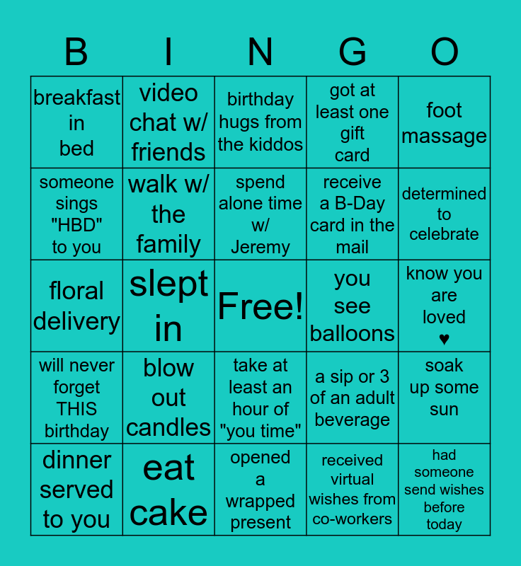 This bingo card has a free space and 24 words: blow out candles, eat cake, spend alone time w/ Jeremy, dinner served to you, foot massage, breakfast in bed, someone sings "HBD" to you, video chat w/ friends, you see balloons, take at least an hour of "you time", receive a B-Day card in the mail, floral delivery, a sip or 3 of an adult beverage, soak up some sun, walk w/ the family, received virtual wishes from co-workers, know you are loved ♥, birthday hugs from the kiddos, determined to celebrate, slept in, had someone send wishes before today, will never forget THIS birthday, got at least one gift card and opened a wrapped present.