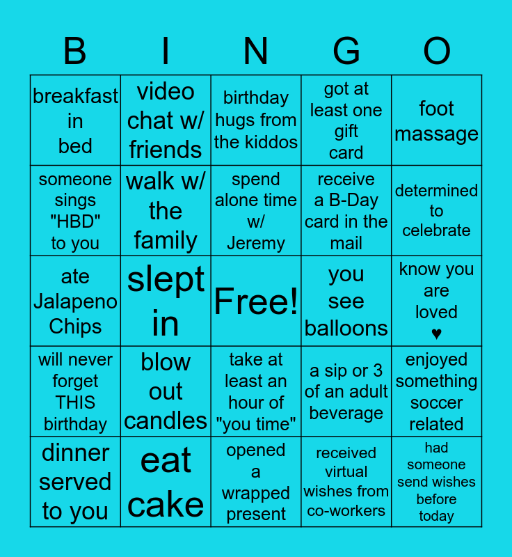 This bingo card has a free space and 24 words: blow out candles, eat cake, spend alone time w/ Jeremy, dinner served to you, foot massage, breakfast in bed, someone sings "HBD" to you, video chat w/ friends, you see balloons, take at least an hour of "you time", receive a B-Day card in the mail, ate Jalapeno Chips, a sip or 3 of an adult beverage, enjoyed something soccer related, walk w/ the family, received virtual wishes from co-workers, know you are loved ♥, birthday hugs from the kiddos, determined to celebrate, slept in, had someone send wishes before today, will never forget THIS birthday, got at least one gift card and opened a wrapped present.