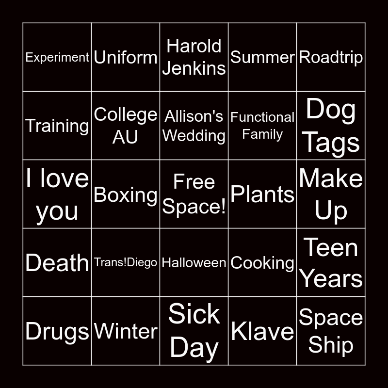 This bingo card has a free space and 24 words: Trans!Diego, Winter, Allison's Wedding, Drugs, Roadtrip, Experiment, Training, Uniform, Plants, Halloween, Functional Family, I love you, Cooking, Teen Years, College AU, Klave, Make Up, Harold Jenkins, Dog Tags, Boxing, Space Ship, Death, Summer and Sick Day.