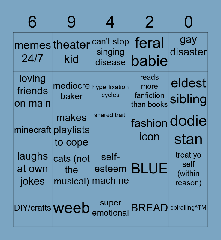 This bingo card has a free space and 24 words: cats (not the musical), weeb, hyperfixation cycles, DIY/crafts, gay disaster, memes 24/7, loving friends on main, theater kid, fashion icon, self-esteem machine, reads more fanfiction than books, minecraft, BLUE, treat yo self (within reason), mediocre baker, BREAD, dodie stan, can't stop singing disease, eldest sibling, makes playlists to cope, spiralling^TM, laughs at own jokes, feral babie and super emotional.