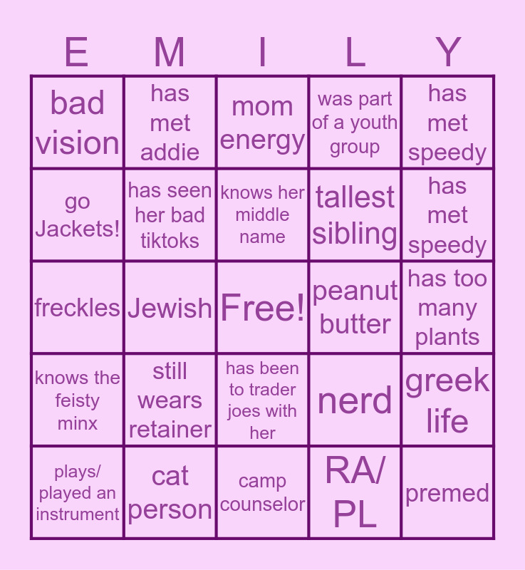This bingo card has a free space and 24 words: still wears retainer, cat person, knows her middle name, plays/ played an instrument, has met speedy, bad vision, go Jackets!, has met addie, peanut butter, has been to trader joes with her, tallest sibling, freckles, nerd, greek life, has seen her bad tiktoks, RA/ PL, has too many plants, mom energy, has met speedy, Jewish, premed, knows the feisty minx, was part of a youth group and camp counselor.