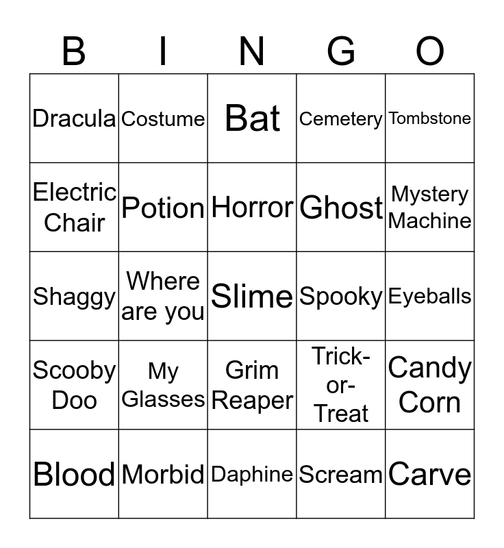 This bingo card has a free space and 85 words: Witch, Souls, Bat, Crow, Night of Sorrow, Goodies, Broomstick, Headless Horseman, Gruesome, Cross, Werewolf, Mummy, Potion, Spooky, Mist, Dracula, Blood, Electric Chair, Afterlife, Scare, Brewing, Ghost, Carve, Nightmare, Where are you, Would you do it for a Scooby Snack?, Jinkies!, Lets Split up Gang, Jeepers, Grovey, My Glasses, Ruh, Roe, Zoikes, Shaggy, Fred, Velma, Daphine, Scooby Snacks, Scooby Doo, Mystery Machine, Mystery, Solve, Clue, Scarecrow, Owl, Pumpkin, Howl, Black Cat, Frankenstein, Vampire, Costume, Horror, Frightfu, Decaying, Hocus Pocus, Psycho, Morbid, Cemetery, Spider, Guts, Creepy, Hayride, Haunted House, Skeleton, Michael Myers, Tombstone, Fangs, Candy Corn, Death, Halloween, Zombie, Monster, Full Moon, Coffin, Bogeyman, Grim Reaper, Scream, Evil, Sorrow, Mask, Eyeballs, Grave, Skull, Trick-or-Treat and Spider.
