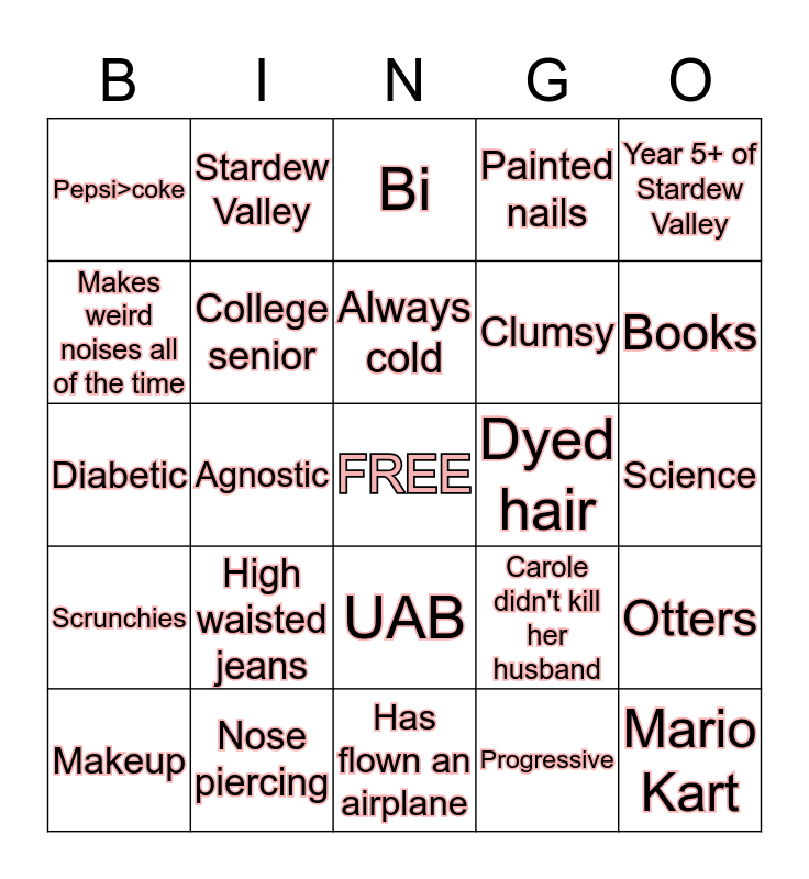 This bingo card has a free space and 24 words: High waisted jeans, Nose piercing, Always cold, Makeup, Year 5+ of Stardew Valley, Pepsi>coke, Makes weird noises all of the time, Stardew Valley, Dyed hair, UAB, Clumsy, Diabetic, Carole didn't kill her husband, Otters, College senior, Progressive, Science, Bi, Books, Agnostic, Mario Kart, Scrunchies, Painted nails and Has flown an airplane.