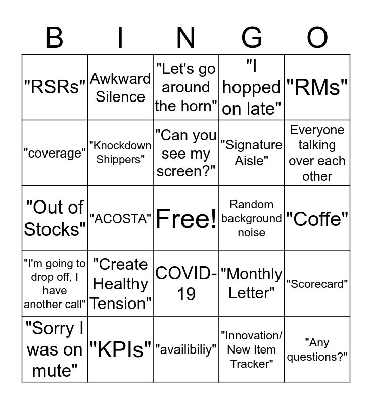This bingo card has a free space and 24 words: "Create Healthy Tension", "KPIs", "Can you see my screen?", "Sorry I was on mute", "RMs", "RSRs", "coverage", Awkward Silence, Random background noise, COVID-19, "Signature Aisle", "Out of Stocks", "Monthly Letter", "Scorecard", "Knockdown Shippers", "Innovation/ New Item Tracker", "Coffe", "Let's go around the horn", Everyone talking over each other, "ACOSTA", "Any questions?", "I'm going to drop off, I have another call", "I hopped on late" and "availibiliy".