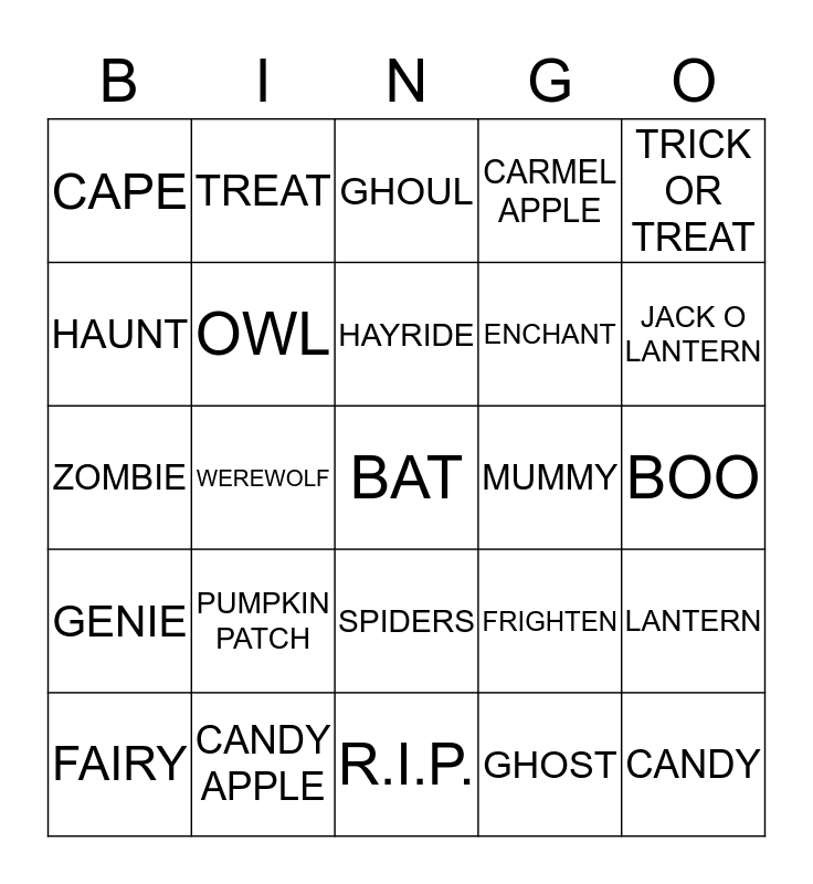 This bingo card has a free space and 43 words: PUMPKIN, CANDY, COSTUME, FAIRY, WITCH, GHOST, GHOUL, CARVE, TRICK OR TREAT, CANDY APPLE, CARMEL APPLE, MUMMY, SPIDERS, PUMPKIN PATCH, MASKS, R.I.P., HAUNTED HOUSE, ZOMBIE, BLACK CAT, JACK O LANTERN, TREAT, CAULDRON, COBWEB, CAPE, BROOMSTICK, BOO, CAT, FALL, FRIGHTEN, GENIE, GOODIES, LANTERN, VAMPIRE, WEREWOLF, WIG, WIZARD, OCTOBER, HAYRIDE, HAUNT, ENCHANT, HOWL, OWL and FULL MOON.