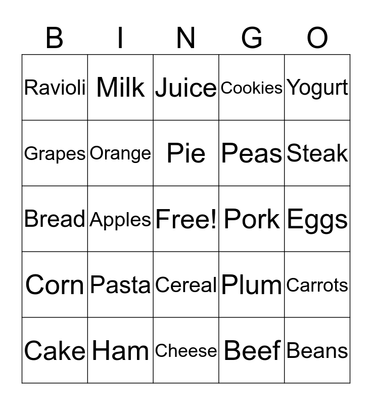 This bingo card has a free space and 24 words: Pasta, Ham, Pie, Cake, Yogurt, Ravioli, Grapes, Milk, Pork, Cereal, Peas, Bread, Plum, Carrots, Orange, Beef, Eggs, Juice, Steak, Apples, Beans, Corn, Cookies and Cheese.