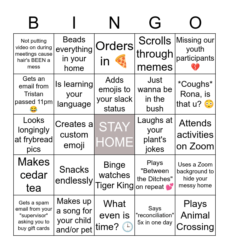 This bingo card has a free space and 24 words: Snacks endlessly, Makes up a song for your child and/or pet, Adds emojis to your slack status, Gets a spam email from your "supervisor" asking you to buy gift cards, Missing our youth participants💔, Not putting video on during meetings cause hair's BEEN a mess, Gets an email from Tristan passed 11pm 😂, Beads everything in your home, Laughs at your plant's jokes, Binge watches Tiger King, Just wanna be in the bush, Looks longingly at frybread pics, Plays "Between the Ditches" on repeat 💕, Uses a Zoom background to hide your messy home, Is learning your language, Says "reconciliation" 5x in one day, Attends activities on Zoom, Orders in 🍕, *Coughs* Rona, is that u? 😳, Creates a custom emoji, Plays Animal Crossing, Makes cedar tea, Scrolls through memes and What even is time? 🕒.