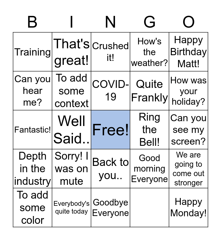 This bingo card has a free space and 24 words: Sorry! I was on mute, Goodbye Everyone, COVID-19, To add some color, Happy Birthday Matt!, Training, Can you hear me?, That's great!, Ring the Bell!, Back to you.., Quite Frankly, Fantastic!, Good morning Everyone, We are going to come out stronger, To add some context, Vacation, Can you see my screen?, Crushed it!, How was your holiday?, Well Said.., Happy Monday!, Everybody's quite today, Depth in the industry and How's the weather?.