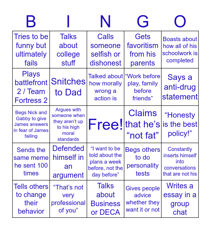 This bingo card has a free space and 24 words: Defended himself in an argument, “That’s not very professional of you”, Talked about how morally wrong a action is, Tells others to change their behavior, Boasts about how all of his schoolwork is completed, Tries to be funny but ultimately fails, Plays battlefront 2 / Team Fortress 2, Talks about college stuff, Claims that he’s “not fat”, “I want to be told about the plans a week before, not the day before”, “Work before play, family before friends”, Begs Nick and Gabby to give James answers in fear of James failing, Begs others to do personality tests, Constantly inserts himself into conversations that are not his, Snitches to Dad, Gives people advice whether they want it or not, “Honesty is the best policy!”, Calls someone selfish or dishonest, Says a anti-drug statement, Argues with someone when they aren’t up to his high moral standards, Writes a essay in a group chat, Sends the same meme he sent 100 times, Gets favoritism from his parents and Talks about Business or DECA.