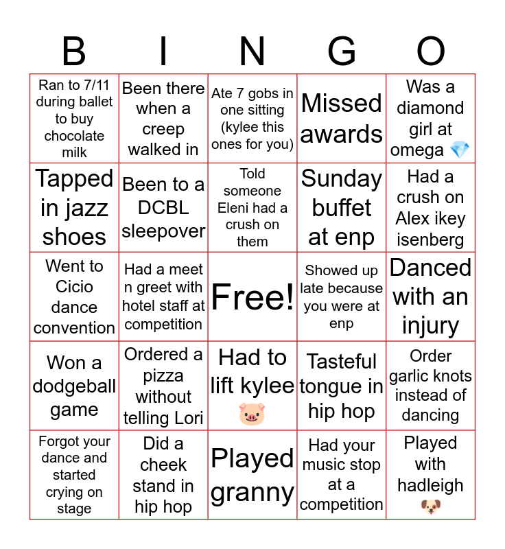 This bingo card has a free space and 24 words: Forgot your dance and started crying on stage, Ordered a pizza without telling Lori, Told someone Eleni had a crush on them, Had your music stop at a competition, Was a diamond girl at omega 💎, Ran to 7/11 during ballet to buy chocolate milk, Been there when a creep walked in, Ate 7 gobs in one sitting (kylee this ones for you), Showed up late because you were at enp, Danced with an injury, Went to Cicio dance convention, Been to a DCBL sleepover, Tasteful tongue in hip hop, Order garlic knots instead of dancing, Tapped in jazz shoes, Did a cheek stand in hip hop, Played granny, Missed awards, Had a crush on Alex ikey isenberg, Won a dodgeball game, Had a meet n greet with hotel staff at competition, Had to lift kylee 🐷, Sunday buffet at enp and Played with hadleigh 🐶.