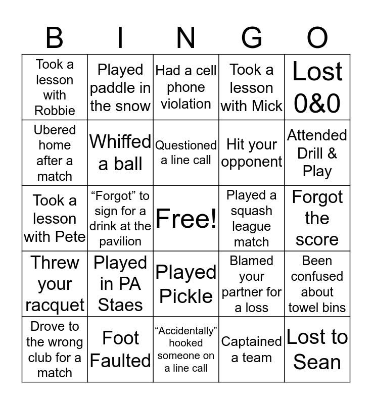This bingo card has a free space and 24 words: Played in PA Staes, Foot Faulted, Questioned a line call, Drove to the wrong club for a match, Lost 0&0, Took a lesson with Robbie, Ubered home after a match, Played paddle in the snow, Played a squash league match, Played Pickle, Hit your opponent, Took a lesson with Pete, Blamed your partner for a loss, Been confused about towel bins, Whiffed a ball, Captained a team, Forgot the score, Had a cell phone violation, Attended Drill & Play, “Forgot” to sign for a drink at the pavilion, Lost to Sean, Threw your racquet, Took a lesson with Mick and “Accidentally” hooked someone on a line call.