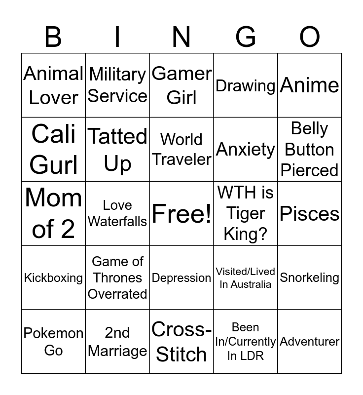 This bingo card has a free space and 24 words: Game of Thrones Overrated, 2nd Marriage, World Traveler, Pokemon Go, Anime, Animal Lover, Cali Gurl, Military Service, WTH is Tiger King?, Depression, Anxiety, Mom of 2, Visited/Lived In Australia, Snorkeling, Tatted Up, Been In/Currently In LDR, Pisces, Gamer Girl, Belly Button Pierced, Love Waterfalls, Adventurer, Kickboxing, Drawing and Cross-Stitch.